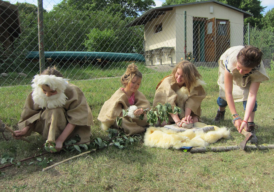 Gemeinsam wird Holz gesammelt für den Bau von Bögen und Speeren, sowie für ein Lagerfeuer. Mit den gebauten Waffen wird ein kleiner Wettbewerb gemacht. Wir jagen das Wildschwein und andere Waldbewohner, die den Steinzeitmenschen als Nahrung dienten (natürlich jagen wir hier nur Attrappen aus Holz und Fell). Nach erfolgreicher Jagd, wird gemeinsam ein Feuer (auf Steinzeitart) und ein Lagerfeuer entfacht. Anschließend gibt es gemeinsam mit den Eltern, Stockbrot und Bratwurst.